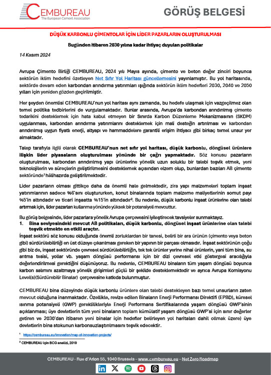 CEMBUREAU DÜŞÜK KARBONLU ÇİMENTOLAR İÇİN LİDER PAZARLARIN OLUŞTURULMASI